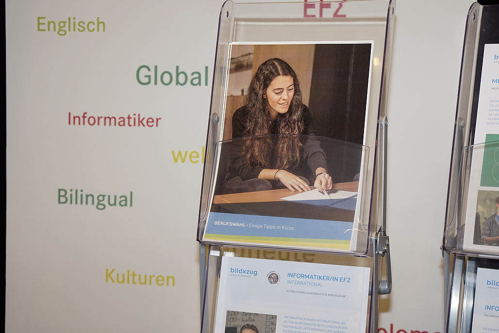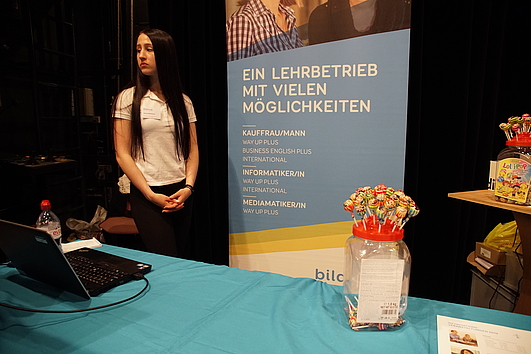 Eine Berufswahlschau was ist denn das? Ich kannte bis vor kurzem nur die ZEBI (Zentralschweizer Bildungsmesse). Schnell wurde mir klar, dass eine Berufswahlschau ähnlich ist. Die bildxzug stellte dort die Lehrberufe Kauffrau/-mann, Informatiker/in und Mediamatiker/in zusammen mit ihren Spezialangeboten, wie die Lehre International vor. Die Berufsbildung International ist eine Lehre in Deutsch und Englisch. In der Unternehmung, wie auch in der Schule und den überbetrieblichen Kursen, wird hauptsächlich in Englisch kommuniziert. Nebst dem waren wir mit dem Projekt Faszination Technik mit dessen Programm "girls for mint" anwesend.