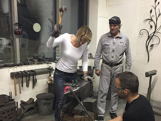 Toni, Andreas, Conny und Sandra formten mit dem hydraulischen Lufthammer die Unterlage für die Buchstaben. Die Bewegung des Lufthammers schien so einfach, doch er brachte das Eisen durch enorme Kraft und mit erstaunlicher Leichtigkeit in Form.