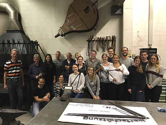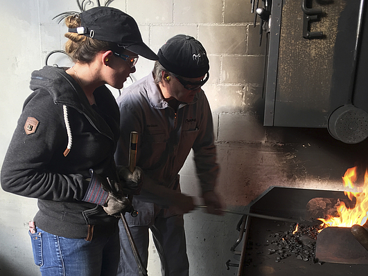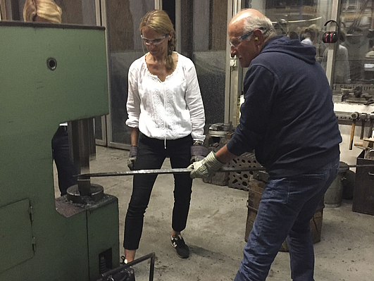 Wir alle waren überrascht, wie schnell das Eisen in einem Kohle-Glühofen anfängt sich zu erhitzen. Nicht mal 5 Minuten sind nötig, bis das Eisen auf Hammer und Amboss in die richtige Form geschlagen werden kann. Jeder konnte sein Buchstabe selbstständig erhitzen und mit verschiedenen Hämmern verzieren.