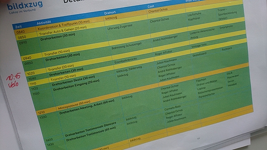 «Für den Dreh des Imagevideos wurde ich draussen und bei bildxzug gefilmt. Der erste Teil zeigte mich auf der Hinreise zu bildxzug. Die Filmcrew der Content Makers erstellte schöne Aufnahmen im Sonnenlicht von meinem Weg zu bildxzug. Als diverse Wegabschnitte gefilmt wurden, schufen wir eine Meeting-Atmosphäre und wurden während dem Besprechen eines nicht existenten Projektes abgelichtet. Zum Schluss des Drehtages durften alle Schauspieler noch ein paar Worte zu bildxzug sagen.»
