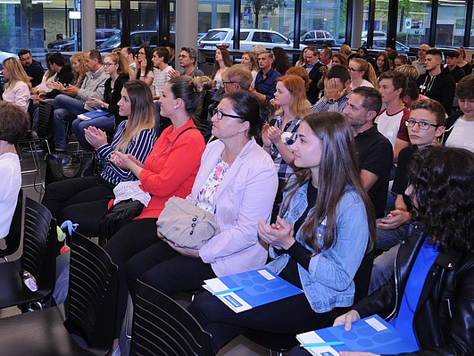 Das bildxzug Team hat sich einzeln vorgestellt und eine spannende Präsentation gezeigt mit allen spannenden Themen wie das Ausbildungskonzept, die Ausbildungspartnerschaften, wie die Betreuung durch bildxzug aussieht und Tipps zum Einstieg in die Berufswelt. Auch das Qualifikationsverfahren war bereits Thema, denn Vorbereitung und Information ist etwas vom wichtigsten. Was sehr eindrücklich war ist, dass die Lernenden von der Geschäftsstelle vor rund 100 Personen präsentiert und dies mit Bravour gemeistert haben.