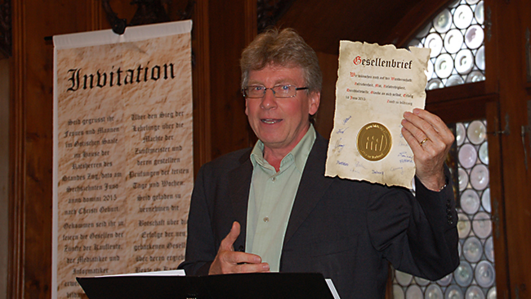Nach der Zeit beim Meister folgten für die jungen Berufsleute zwingend die Wander- und Gesellenjahre. «So nehmt die Chance wahr, nach diesem ersten Abschluss der beruflichen Grundbildung, auf Wanderschaft zu gehen, euer Wissen und eure Fähigkeiten mit neuen Erfahrungen und Erkenntnissen zu bereichern und das Ziel einer Meisterprüfung vor Augen zu halten!» empfiehlt Gauderon den Lernenden. «Tapferkeit, Treue und Festigkeit – mit diesen drei Rittertugenden – kombiniert mit den drei Wünschen zur Ehrlichkeit, zum Mut für Neues und Durchhaltewille in schwierigen Zeiten lassen wir euch ziehen hinaus in die Berufswelt – in der Hoffnung, dass ihr in der «Zunft zu bildxzug» das Handwerk erlernt und eure Persönlichkeit gestärkt habt!»