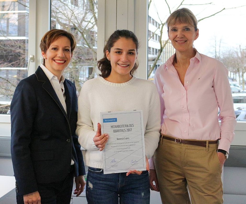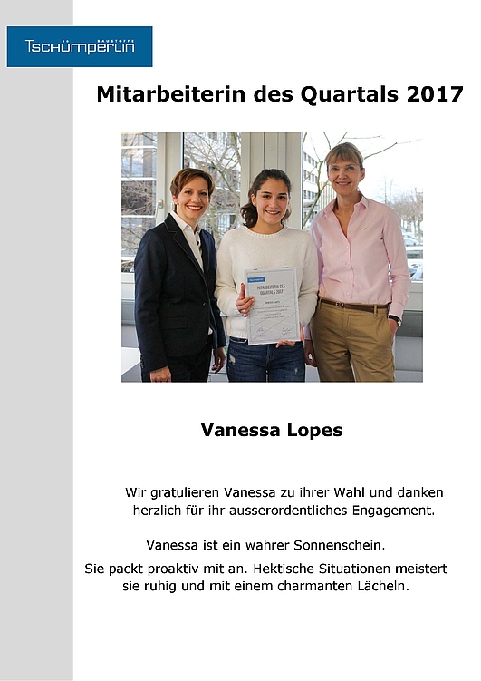 Unsere kaufmännische Lernende im 2. Lehrjahr, Vanessa Lopes, wurde von der Tschümperlin AG zur Mitarbeiterin des 4. Quartals 2017 auserkoren. Diese Auszeichnung gewinnen Mitarbeiterinnen oder Mitarbeiter mit einem überdurchschnittlichen Verhalten und Engagement. Als Dankeschön erhält Vanessa einen grosszügigen Bonus.