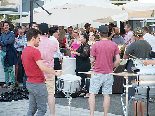 Nach einigen beschwingten Melodien des Bläserensemles löste der Geschäftsleiter Beat Gauderon das Rätsel. Vor dem Outdoor-Schachspiel sprach er über den Zusammenhang von Bildung und Schachspiel. «Das Schach gilt als das Königsspiel, in dem Strategie und Kombination gefragt sind, das Einheit von Theorie und Praxis verkörpert. Mit dem erfolgreichen Abschluss seid ihr schon alle Königinnen und Könige.», so begann er seine Rede, die an die jungen Berufsleute gerichtet war. «Bereits mit dem Lehrbeginn vor drei oder vier Jahren habt ihr euer Spiel eröffnet und während der Ausbildung die Figuren auf der Basis eurer eigenen Strategie entwickelt. Damit habt ihr die gleichen Ziele angestrebt wie das Schachspiel: mit Strategie, mutigen Entscheidungen und verschiedenen Kombinationen den Gegner einengen und besiegen!» Doch was gilt es wohl in der Berufsbildung zu besiegen? Das eigene Wissen schützen, auf die eigenen Stärken vertrauen, die möglichen Verluste wieder mit geschickten Zügen kompensieren, der Umgang mit kleinen Niederlagen, das sei im Schach wie auch im realen Leben, im Bildungsprozess anzustreben. Das Schach widerspiegle das Leben in seinen Gegensätzen von hell und dunkel, Erfolg und Niederlage, Hoffnung und Zweifel, so Gauderon weiter. Schliesslich sei jeder für sein eigenes Verhalten und Lernen verantwortlich, ob als Einzelspieler im Schach oder als Lernende im Lernprozess. Mit der Symbolik der verschiedenen Schachfiguren verglich Gauderon die Kompetenzen der jungen Erwachsenen: die Dame, die als die beweglichste Figur gelte und sehr agil handeln könne; der Springer, der nicht einfach gerade Wege ziehen kann, immer wieder auch Querzüge machen muss, dafür andere Figuren überspringen darf; der Läufer, der die Übersicht behalten kann und rasch die Diagonalen beherrscht. Alle Figuren haben ihren Charakter, so auch der Turm, der die Beharrlichkeit, den Schutz symbolisiert und Halt bietet. Schliesslich kam er auf den Bauern zu sprechen, von deren es insgesamt acht Figuren hat. Die Acht als magische Zahl, die für Gerechtigkeit, Harmonie, weises Handeln und die Balance zwischen Nehmen und Geben steht. «Sind dies nicht Eigenschaften, die im Leben zentral und speziell im Beruf gefragt sind?» stellt der Redner die Frage. So könne man auch einmal einen Bauern verlieren, um neue Wege zu entdecken. Mit jedem Zug würden sich neue Freiheiten der Entscheidung eröffnen. «Und was heisst dies nun für euch als junge Berufsleute? Strategie entwickeln, das Zentrum, das Wesentliche beherrschen, sein Selbstbewusstsein stärken, Mut haben und entscheiden. Im Wissen, dass jede Ursache seine Wirkung zeigt und Konsequenzen hat.» Doch nach einigen Minuten Rede blieb immer noch die Frage offen, was Schach mit Fussball zu tun hätte. Gauderon erklärt: «Bei den Recherchen bin ich auf einen Beitrag eines tschechischen Trainers gestossen, der sagt, dass Fussballer, die Schach spielen, auf dem Feld die bessere Übersicht hätten.»