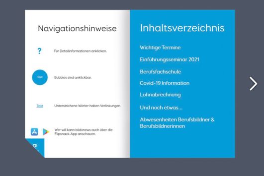 Um das passende Tool für das Magazin zu finden, recherchierte ich viel im Internet. Da viele Tools eine Testversion haben, konnte ich sie ausprobieren. Nachdem ich das passende Tool fand, starteten wir mit der Umsetzung. Ich setzte mich an die Gestaltung und Kelly an den Inhalt des Magazins. Es sollte abwechslungsreich, interaktiv und attraktiv sein. Insbesondere sollte das neue Magazin weniger Fliesstext haben als die bisherige LL-Info. Den Wiedererkennungseffekt zu bildxzug erhielten wir mit dem Namen «bildxnews». Zudem hielten wir uns an die Farbwelt und das Look and Feel von bildxzug.